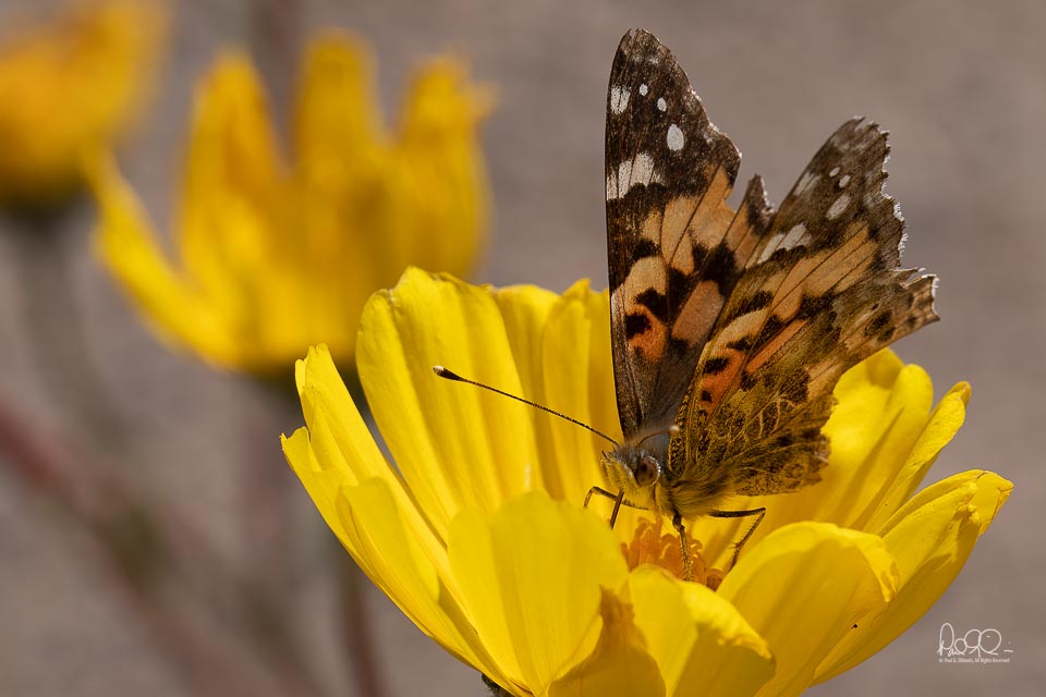 Painted Lady Butterfly, Vanessa virginiensis, on Desert Gold Wildflower, Gerea Canescens, Death Valley national Park